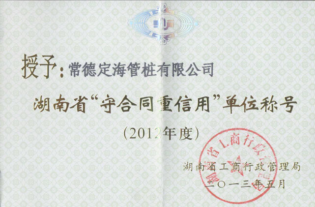 經(jīng)湖南省工商行政管理局在湖南日報(2013年5月24日)第10版公示,公司及常德市77家單位獲得2012年度守合同重信用單位。